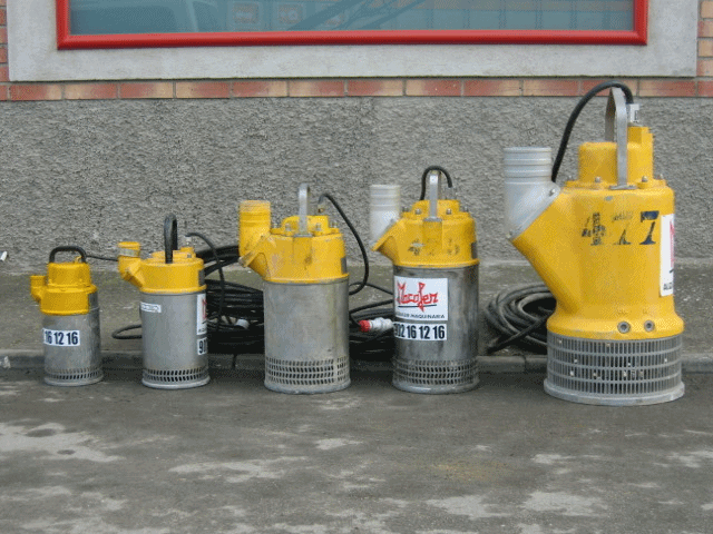 Bombas de achique de agua eléctricas, desde 1.5 CV. hasta 30 CV., con gran variedad de mangueras hasta 6 pulgadas.